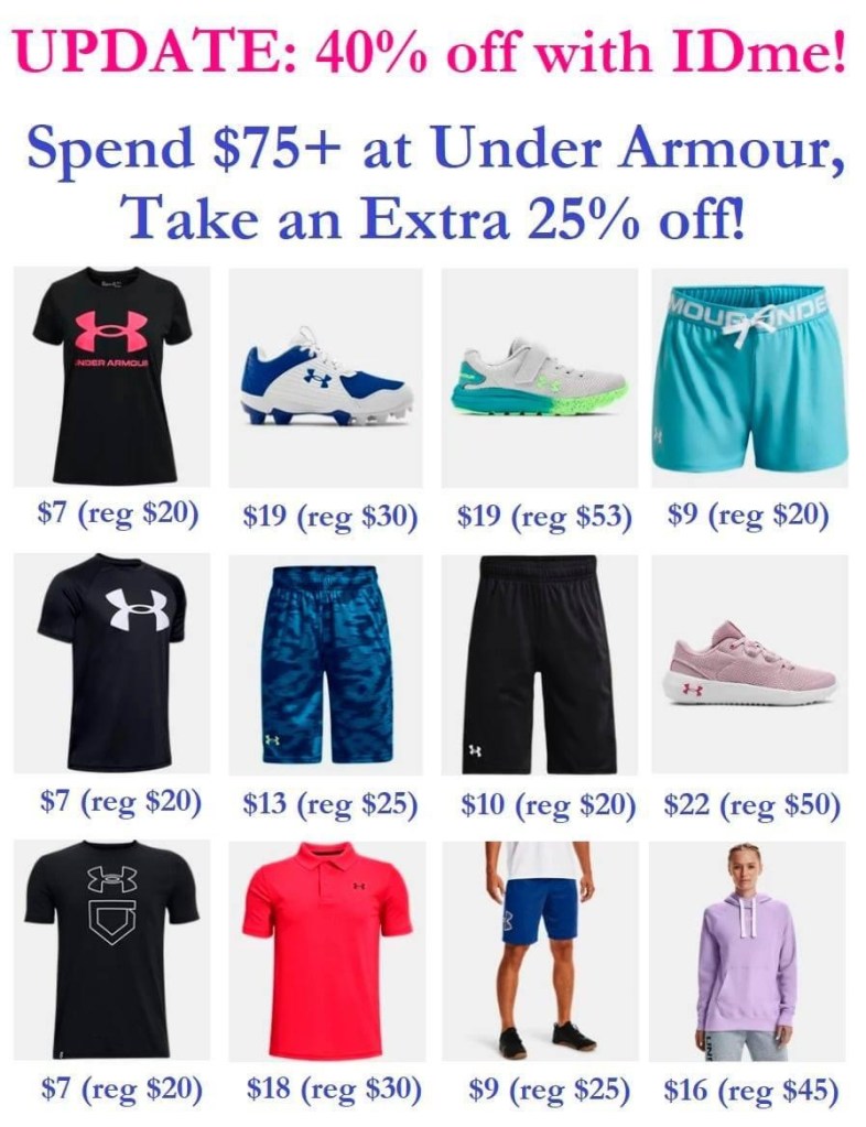 GO!!! Take an extra 25% off $75+ orders at Under Armour with code SPRING25 OR…get a whopping 40% off with IDme! This will work for healthcare workers, teachers, and military. I don’t fall into any of those categories, but please let me know if it’s working for you! Here are some of the 25% off deals I found, the 40% off will be even better!!! Shipping is free when you sign in with your email address. #ad