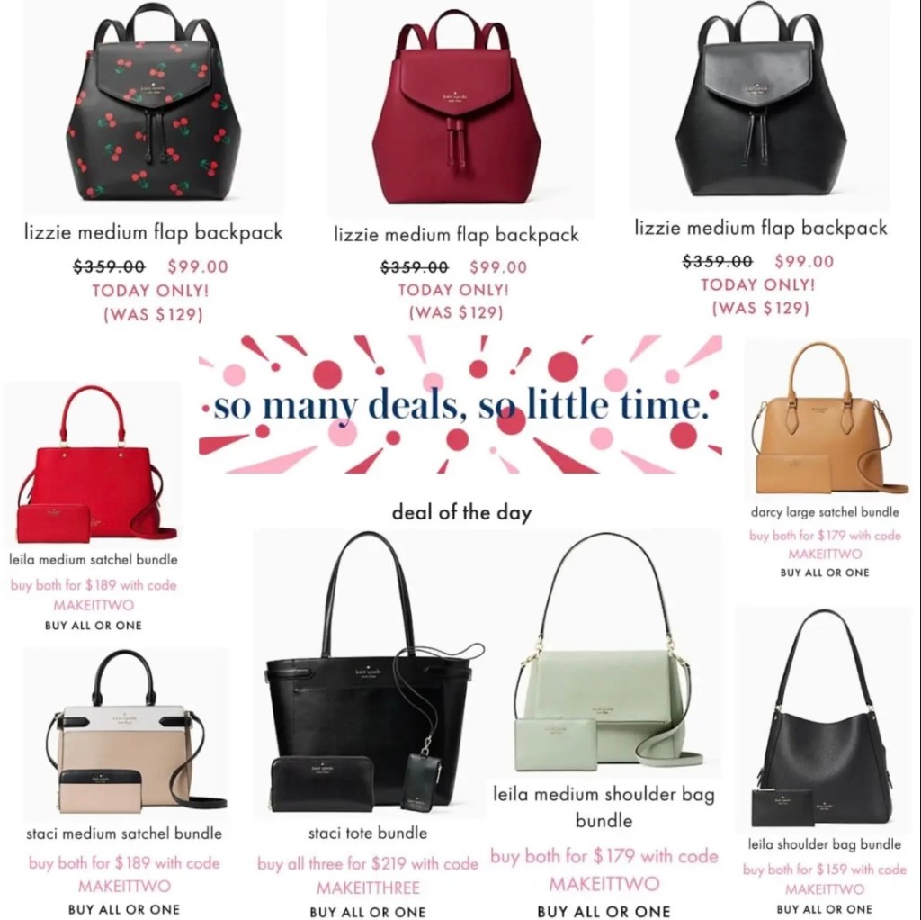 π₯π₯π amazing scores on Kate Spade β οΈ- 24 HRs only! Save 60-70% off on the Lizzie backpack or Bundle deals with a variety of bags & wallets combined for INCREDIBLE savings! Use code MAKEITTWO for bundles! Great time to snag one for a gift & one for yourself! #ad