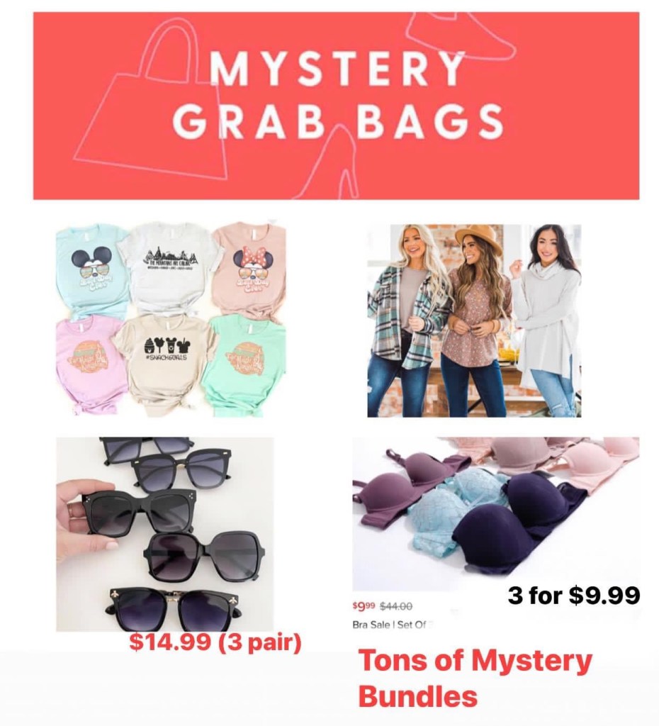 OMG š±š„š„ MYSTERY BAG TIME at JANE!!! So fun!! Pages of items!! Pick a mystery grab bag – you pay for 1 item and get 3!!! Most grab bags are 2 – 3 items and F REE SHP! See below mystery sunglasses 3 pairs 14.99 – Disney trip Ts 26.99 for 3! Bras 9.99 for 3!