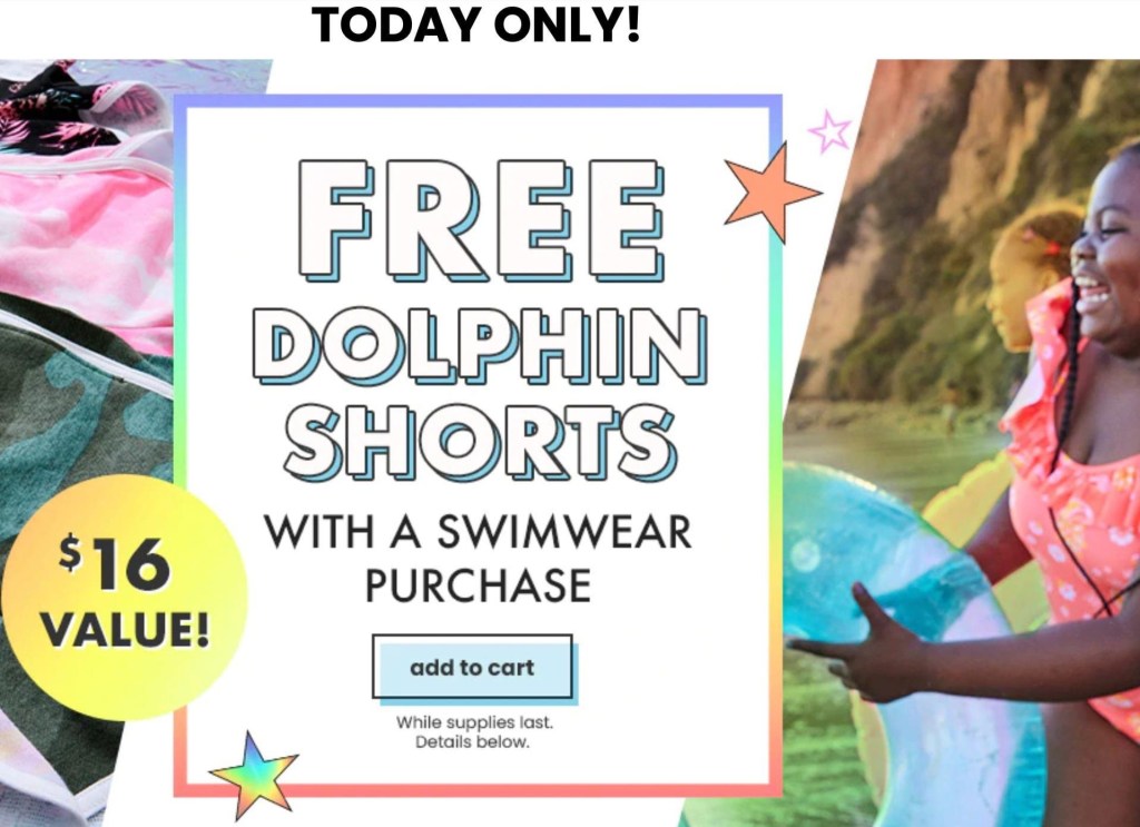 💃💃💃 Justice fans! TODAY ONLY! Get a freeee pair of Dolphin shorts with your swimwear purchase. Plus 💲12 packable wind breakers, 50% off c learance, and 25% site wide. Tell us if you score. #ad