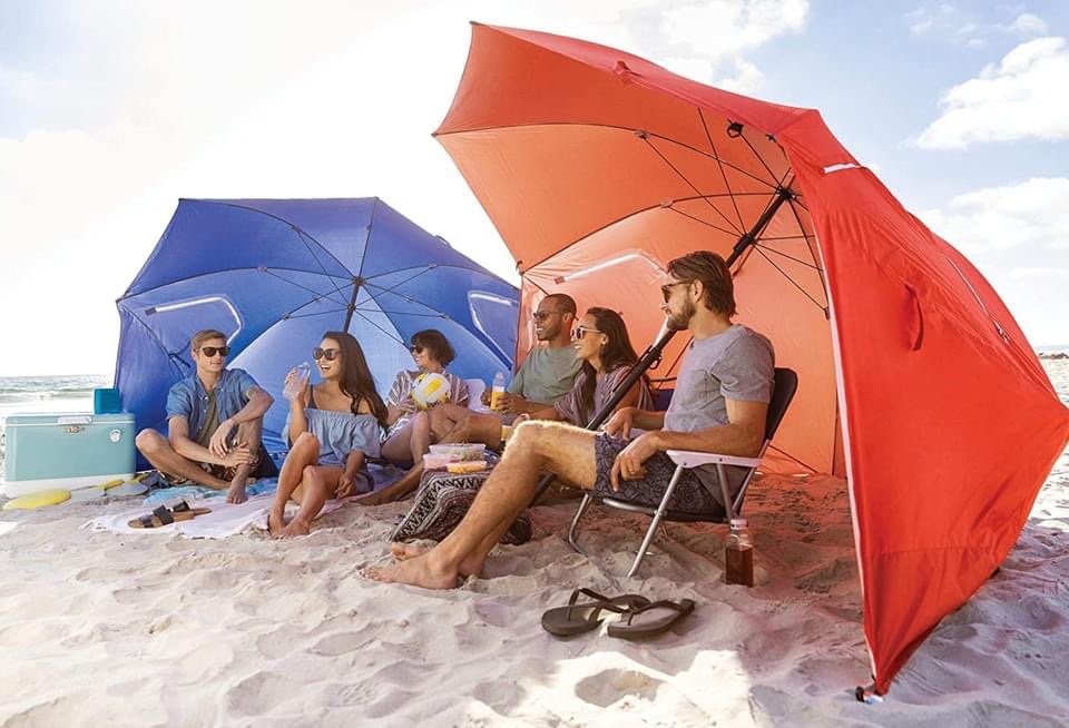Sport-Brella Super Brella under forty-five!!! XL is under seventy (depends on color)!!! My friend has these and says they are fantastic – very easy for one person to set up alone. At the beach, she loads the side pockets up with as much sand as possible – this holds it steady in wind, without needing stakes. Tell us if you get one or have one!!! Ad
