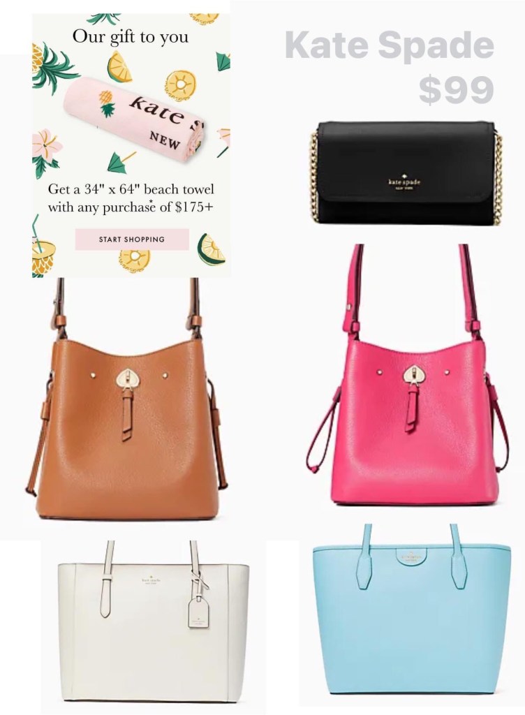 π₯π₯π₯ ALL 89-99!!! ππTODAYβS DOUBLE D EAL!! All these beautiful KATE SPADE Bags are down to 99 (was 349-399)!!!! Bonus BEACH TOWEL if you spend 175! Amazing to π Let me know if you grab!!!