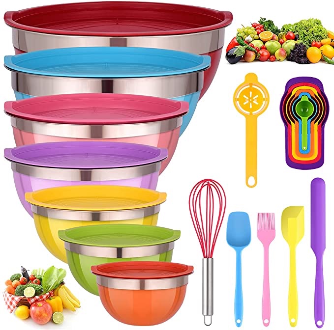 This mixing bowl set comes with all the luxury accessories like spreader spatula,basting brush,spatula,spatula spoon,egg whisk,egg separator and 6 measuring colorful spoons and drops by 50% with Raining Deals link below! Tell us if you got it! #ad