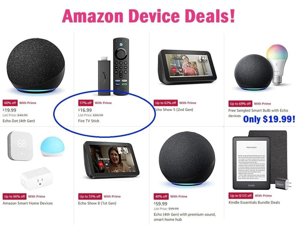 Super awesome đ Amazon device d eals are already live! These should be the same as Prime Day pricing, so go ahead and grab them now! Get a Fire TV Stick for only 16.99 or an Echo Dot + Smart Bulb for only 19.99