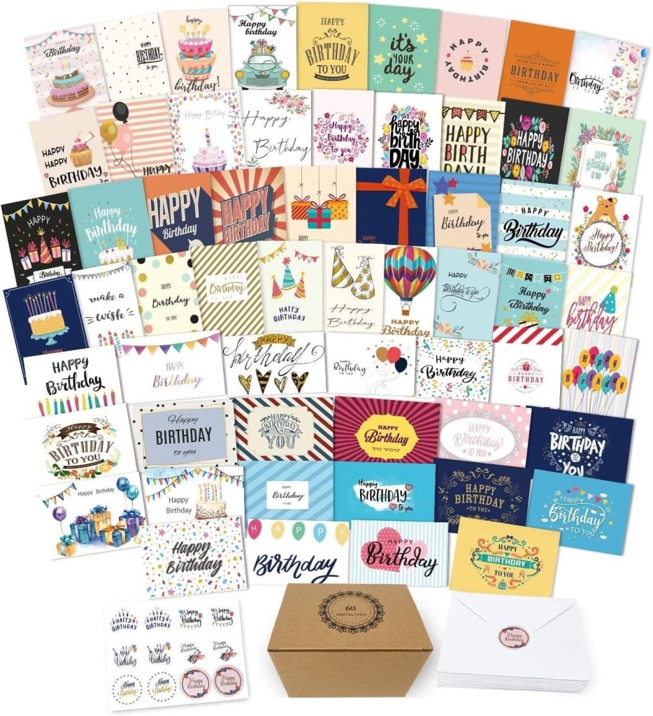 ⭐️⭐️⭐️ OH MY!! FANTASTIC savings on this lovely set of Birthday Cards!! 🥳 Always be prepared with this fabulous set of 60 birthday cards!! These are great quality cards and a generous 5×7″ size. Includes 60 cards (no duplicates), envelopes and sealing stickers.