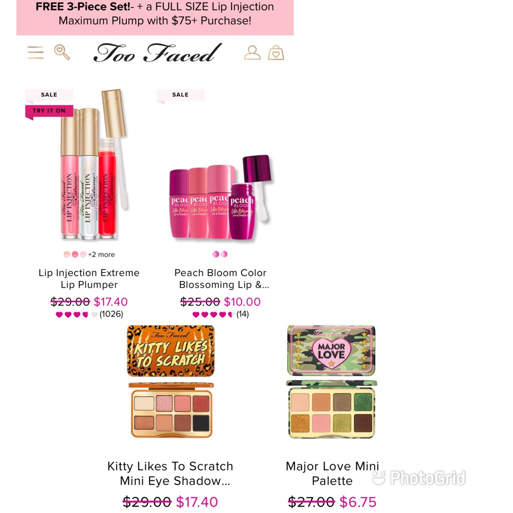 HOLY SMOKES ππTHIS NEVER HAPPENS π₯π₯π₯π₯ 75% off Too Faced cosmetics- just look at those pr!ces!!! Also spotted eyelashes for only 8.50! PLUS If you shop for 75, you also get a 3-pcs set AND a full size lip injection π pls holler if you snag! #ad l!nk in comments