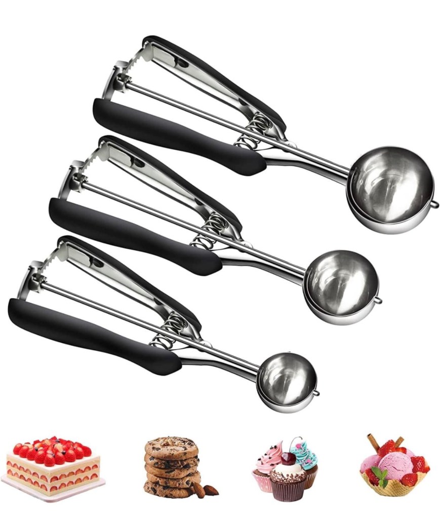 🍪🍧🍉 Save on the set of THREE highly-rated stainless steel scoops! You get 3 sizes, perfect for scooping frozen treats, balling melons, and making the perfect size cookies!