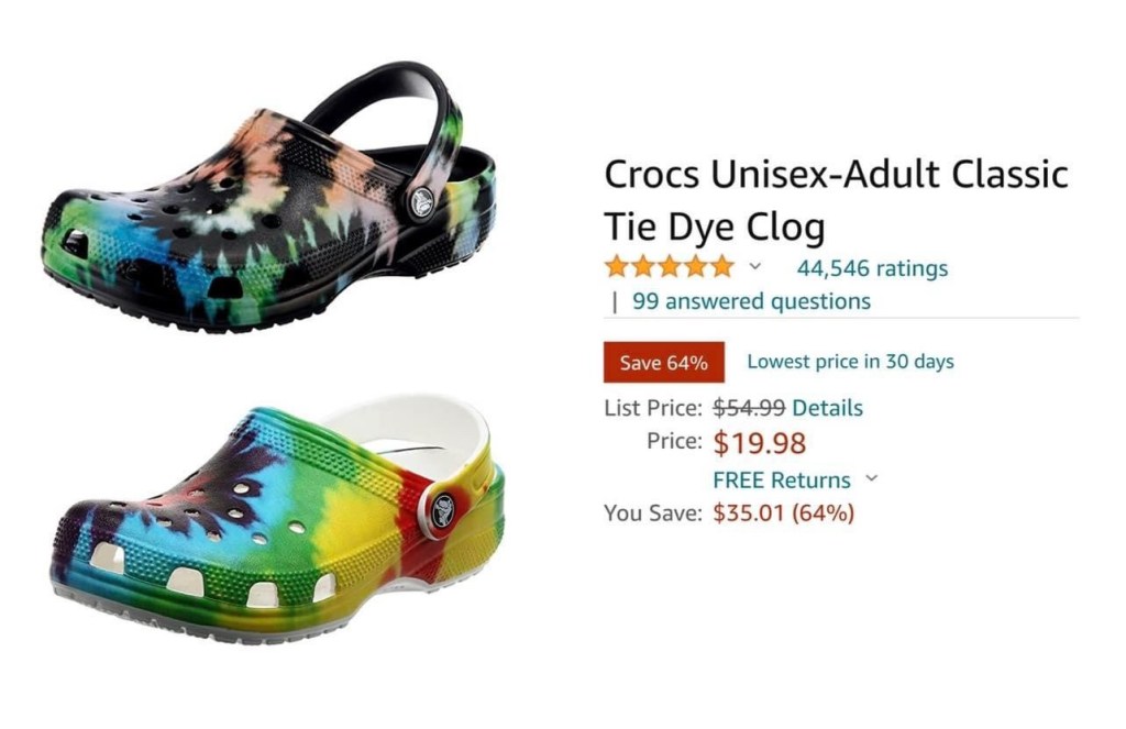 HURRY!! ππΌββοΈππΌββοΈ Crocs Adult Tie Dye Clogs 64% off! Remember these will fit the kiddos too – size down 2 sizes (adult 7 in a kids 5)! Tell us if you get one. #ad l!nk in comments