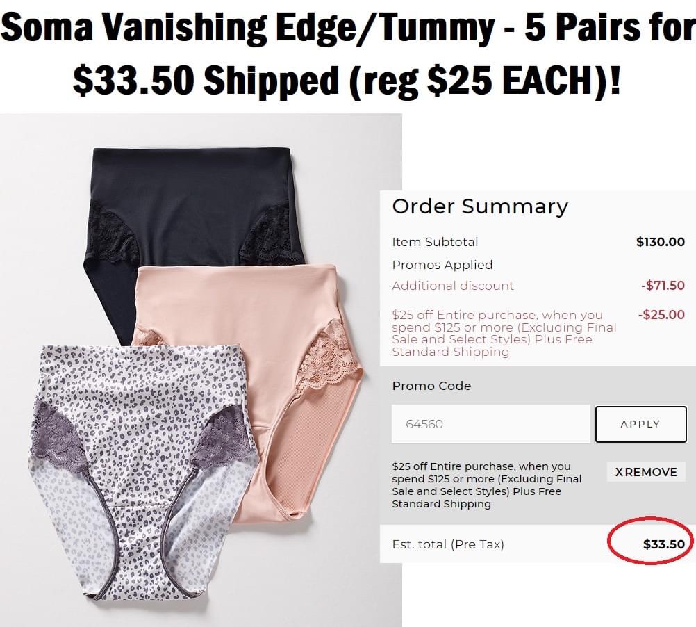 😱😱😱😱 Get 5 pairs of Soma Vanishing Edge/Tummy for only 33.50 (reg 25 EACH) + free shipping! Just add 5 of the 💲25+ pairs to your cart and use 64560 at checkout. Please LMK if it works for you too!. #ad l!nk in comments