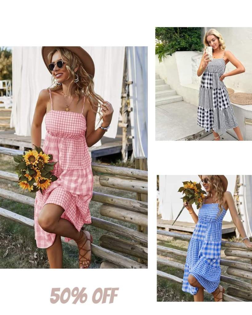 KAYWIDE Women’s Boho Summer Dress Plaid Spaghetti Strap Dress Square Neck Backless Tiered Ruffle Flowy!! Perfect for summer to fall!