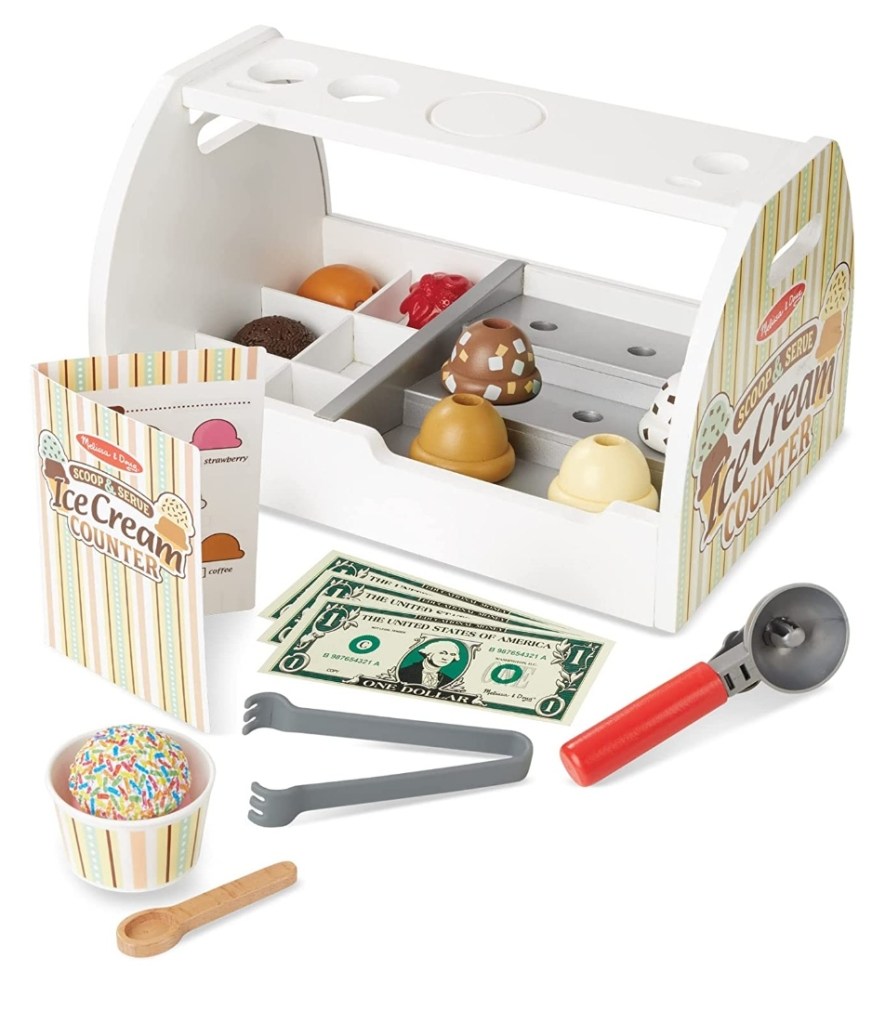 Melissa and Doug Ice cream Counter!!! If you’re looking for a toy that they will not discard after the holiday excitement ends! This Comes with scoopers, serving counter, tons of flavors and ice cream toppings and even a menu and money! Let us know if you got #ad l!nk in comments💬