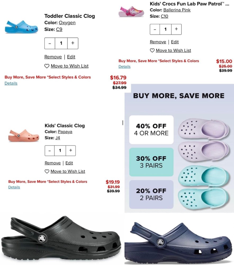 It’s the buy more save more sale at Crocs!! If you grab 4 pairs, you get 40% off your order, and it does work on top of sale prices!! F r e e ship at 49.99! Pr!ces below are with 4 pairs in the cart! It does appear to exclude some colors so try different ones if it’s not working for you! #ad holler if you snag. L!nk in comments