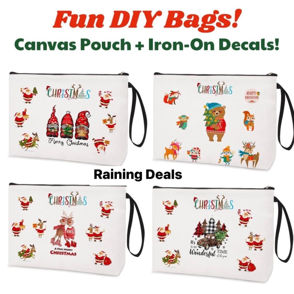 ❤️💚 What a fun and easy DIY project! These plain canvas pouches come with a set of Christmas-themed iron-ons to create your own design! You get ONE 10”x6” zipper bag with a sheet of 11 decals. Valid on multiples.