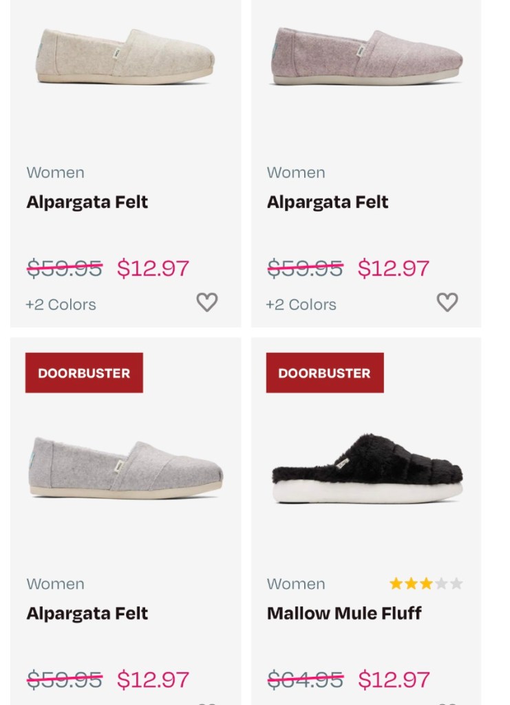 SAY WHAT?!!!! 😱😱😱😱 TODAY ONLY – TOMS are 12.97 (reg. 60)! Sizes are flying so please say if you get one. L!nk in comments