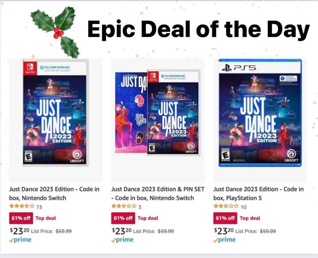 61% off suppimiraDecember 7, 2022Deals Post navigation PreviousNext 💥💥💥 Amazon’s Epic D eal of the Day!! Save 61% off Just Dance 2023! Did you snag? #ad 👇👇👇 SHOP DEAL Share this: Share on X (Opens in new window) X Share on Facebook (Opens in new window) Facebook Like Loading...
