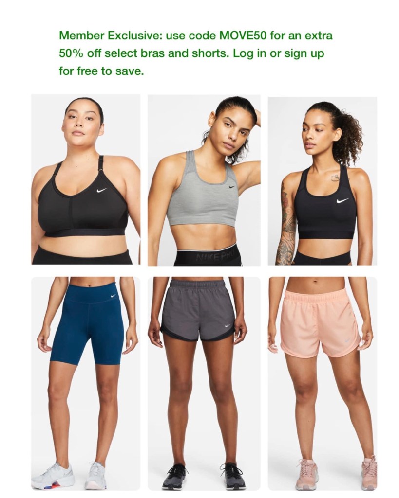 Today at Nike, take 50% off bras and shorts when you LOG IN, then use MOVE50 at checkout. FS too!!! Some sports bras from 10!