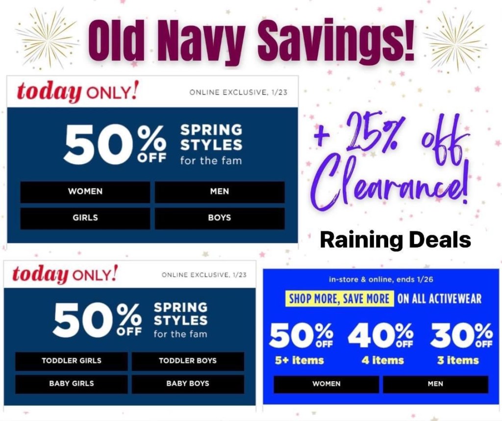 💥🔥 HOLY smokes! There’s a lot going on over at Old Navy today! Score 50% off Spring styles for adults, kids and babes. Score 50% off activewear when you purchase five items. AND, take an EXTRA 25% off cle@rance when you head to checkout (the savings auto-apply)! #ad 👇👇👇