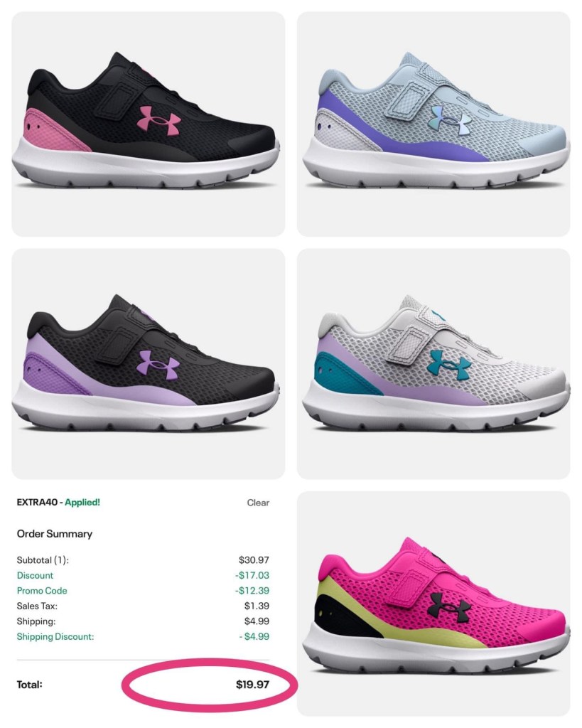 π₯π₯TODAY ONLY!!! Toddler girl UA shoes 19.97 shpped in all of these colors and fully stocked! The UA s@le today is π₯π₯. Use EXTRA40 at checkout and log in for FS!!! There are bigger kid options too for great scores!!! #ad πππ