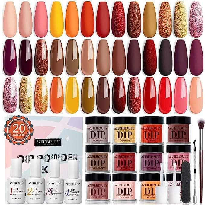 💰11.99 Dip Powder Nail Kit Starter, AZUREBEAUTY 20 Colors Sunset Glitter Red Nude Brown Dip Nail Kit