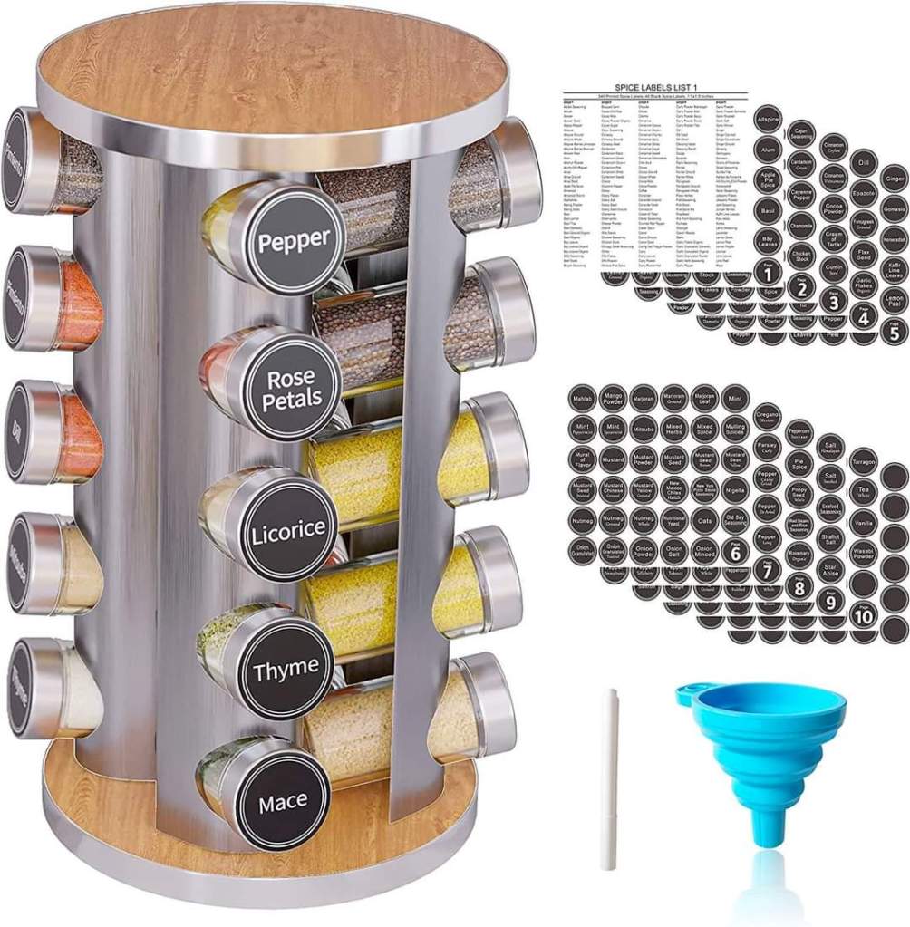 New England Stories Revolving Spice Rack Set with 20 Spice Jars, Kitchen Spice Tower Organizer for Countertop or Cabinet – Carousel Storage #ad