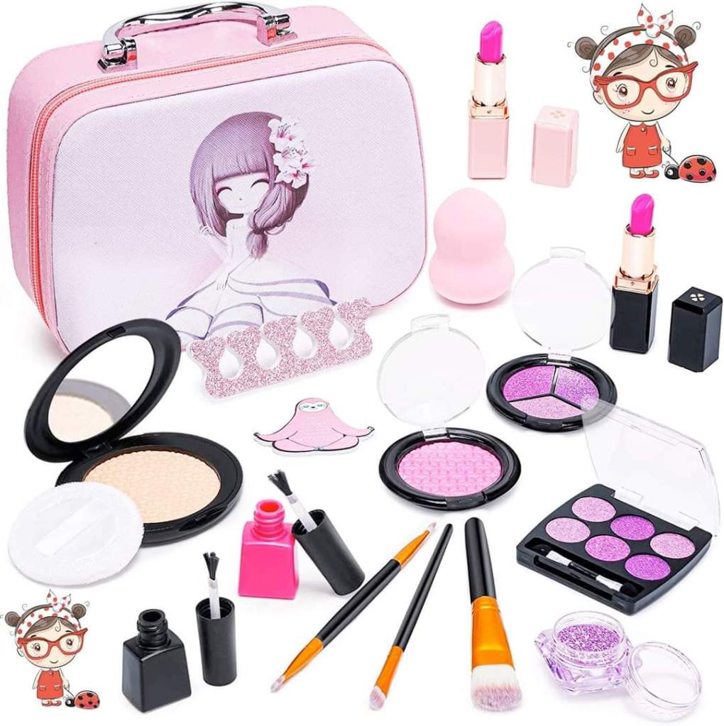 SHIRLIN Pretend Makeup for Girls Kids Makeup Kit for Girls with Beauty Cosmetic Case, Pretend Play for Toddlers Toys with Cosmetic Bag for Birthday, #ad
