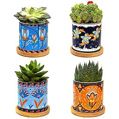 Garnome Ceramic Succulent Pots Pack of 4-3in with Drainage and Bamboo Tray, Cactus Planter Pot, Flowers Pot, Home Office Desk Garden Mini Pot Indoor Decoration is on dr0p ,#ad
