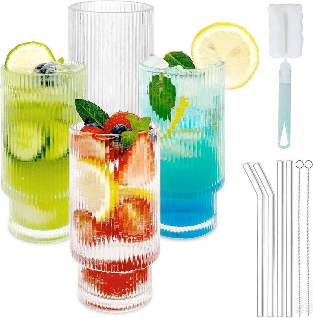 FINFINLIFE Ribbed Glass Cups with Straws – Premium 12oz Glassware with Easy-to-Clean Accessories, dr0ps at checkout + use GBFLXCRO at checkout to save extra 30% ,#ad
