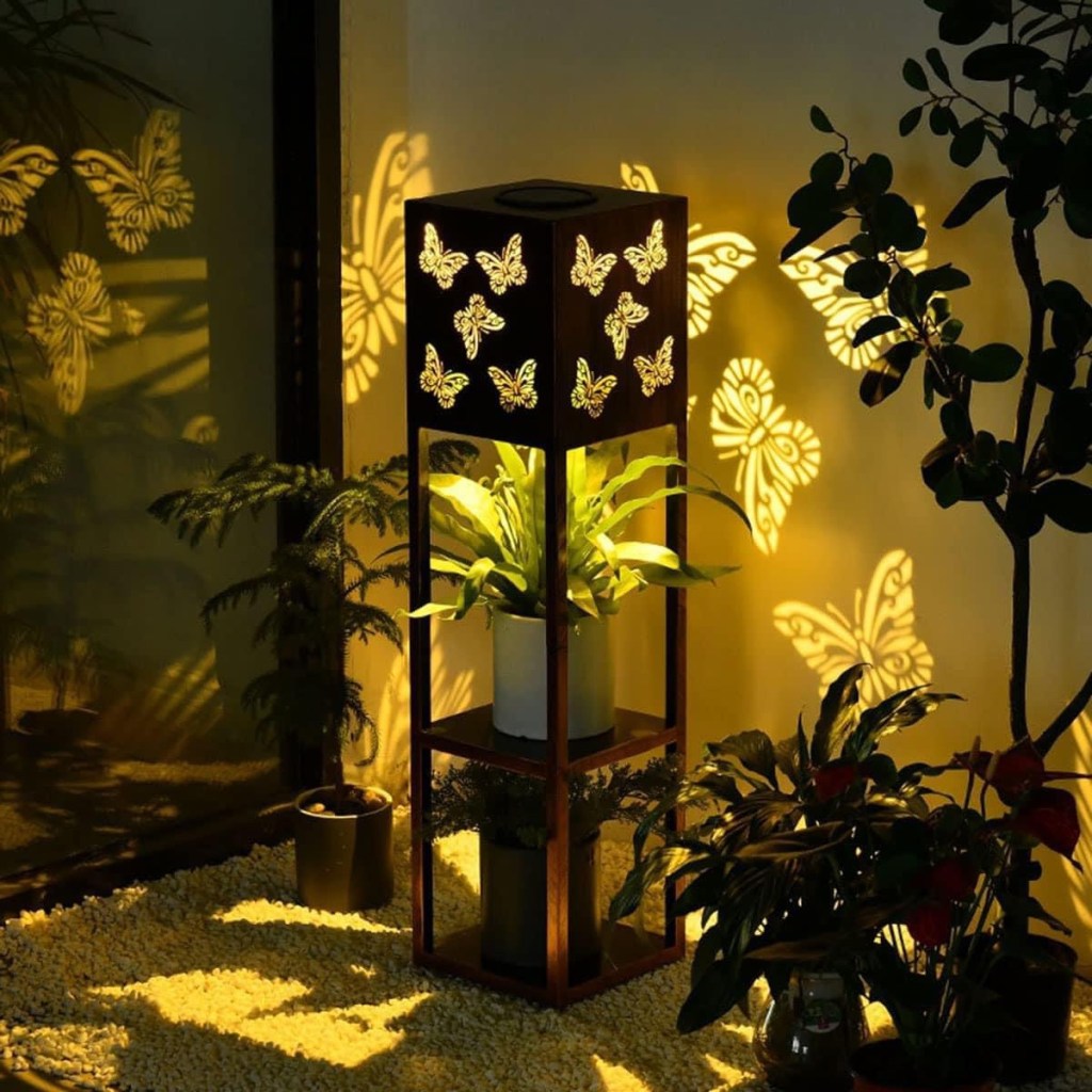 ✨✨✨This metal solar-powered plant stand is absolutely gorgeous! Beautiful pierced stainless steel light box with 2 lower shelves. This is stunning for your porch or patio. Valid on Butterfly option ONLY.