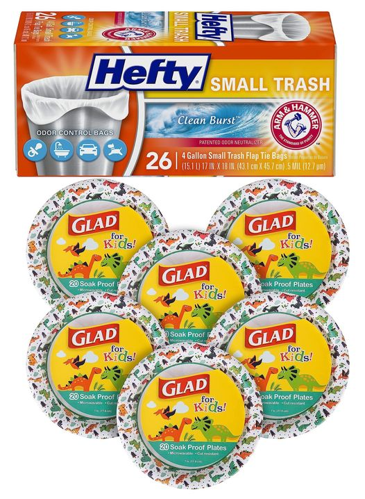 Glad for Kids 7-Inch Dino Paper Plates now on a 43% price drop and Hefty Flap Tie Small Trash Bags have a 40% off coupon to clip on your first subscribe & save order! Tell us if you got it! #ad