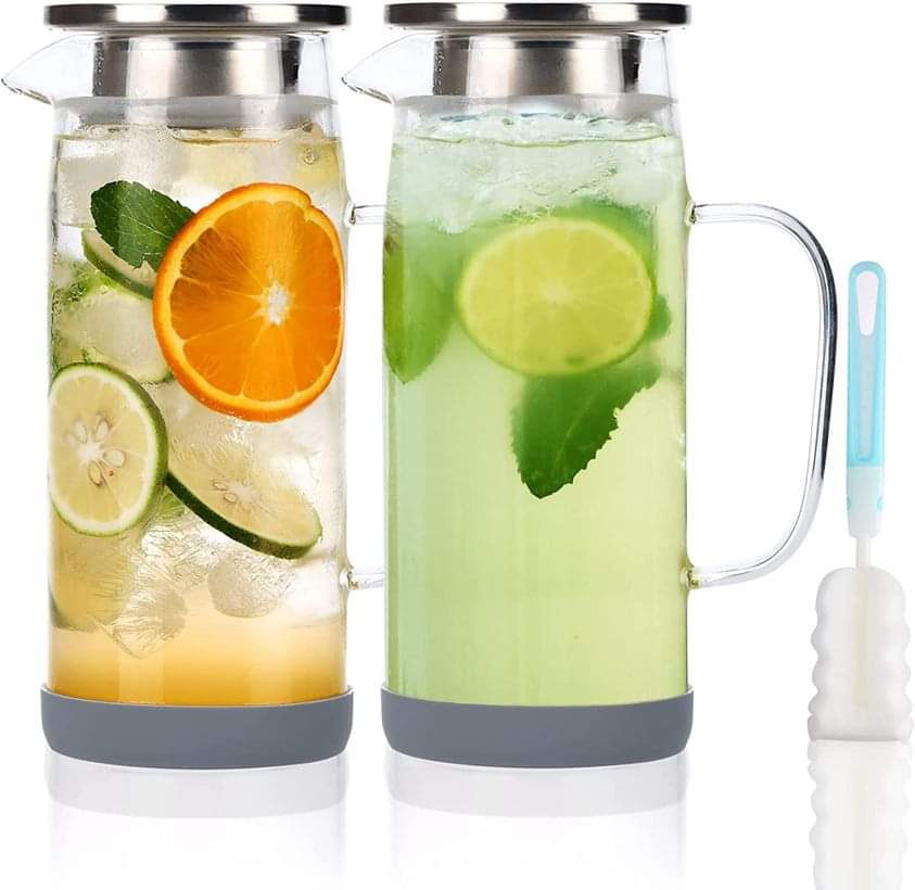 CUCUMI 2pcs 35oz Glass Water Pitcher with Stainless Steel Lid and Spout, 1 Liter Glass Carafe with Handle Heat Resistant Glass for Iced Tea, Coffee, Milk, Juice #ad