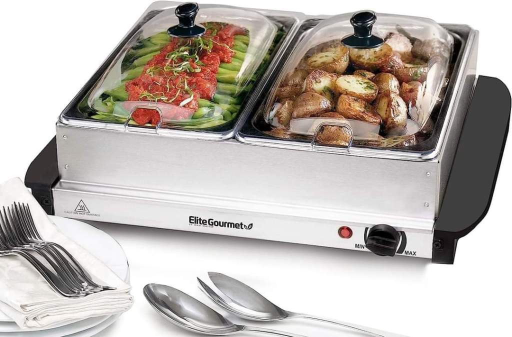 Elite Gourmet EWM-6122# Dual 2 x 2.5 Qt. Trays, Buffet Server, Food Warmer Temperature Control, Clear Slotted Lids, Perfect for Parties, Entertaining & Holidays, 5 Qt Total, Stainless Steel #ad