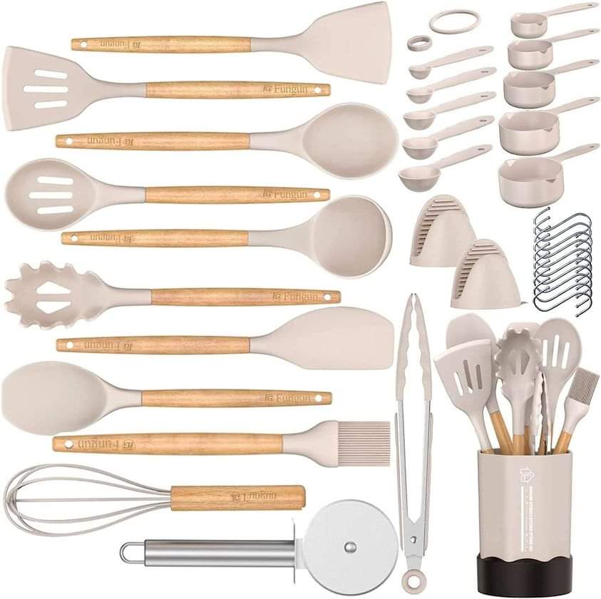 Kitchen Cooking Utensil Set, Fungun 35 pcs Cooking Utensils – Nonstick Kitchen Utensils Cookware Set Spatula Set -Kitchen Gadgets Utensils Set, Kitchen Tools Gift-khaki