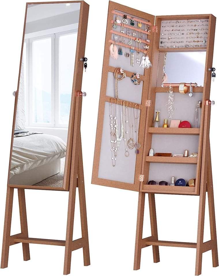 LUXFURNI Jewelry Armoire Standing Full-Length Mirror Makeup Lockable Cabinet, Large Cosmetic Storage Organizer Wall Mount/Door Hanging (Orange)