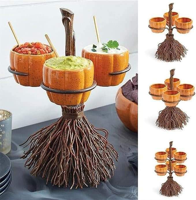 OMG!!! The coolest Halloween find for entertaining! TeoYes Creative Halloween Resin Pumpkin Bowls on Broom for Serving Fruit Salad Snacks Halloween Party Supplies Decorations (3 cups)!!!