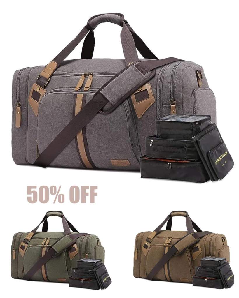 Canvas Duffle Bag for Travel, Waterproof Weekender Bag with Shoes Compartment!! Large Carry on Duffel Bag with 6 Set Packing Cubes, Expandable Bag!!!