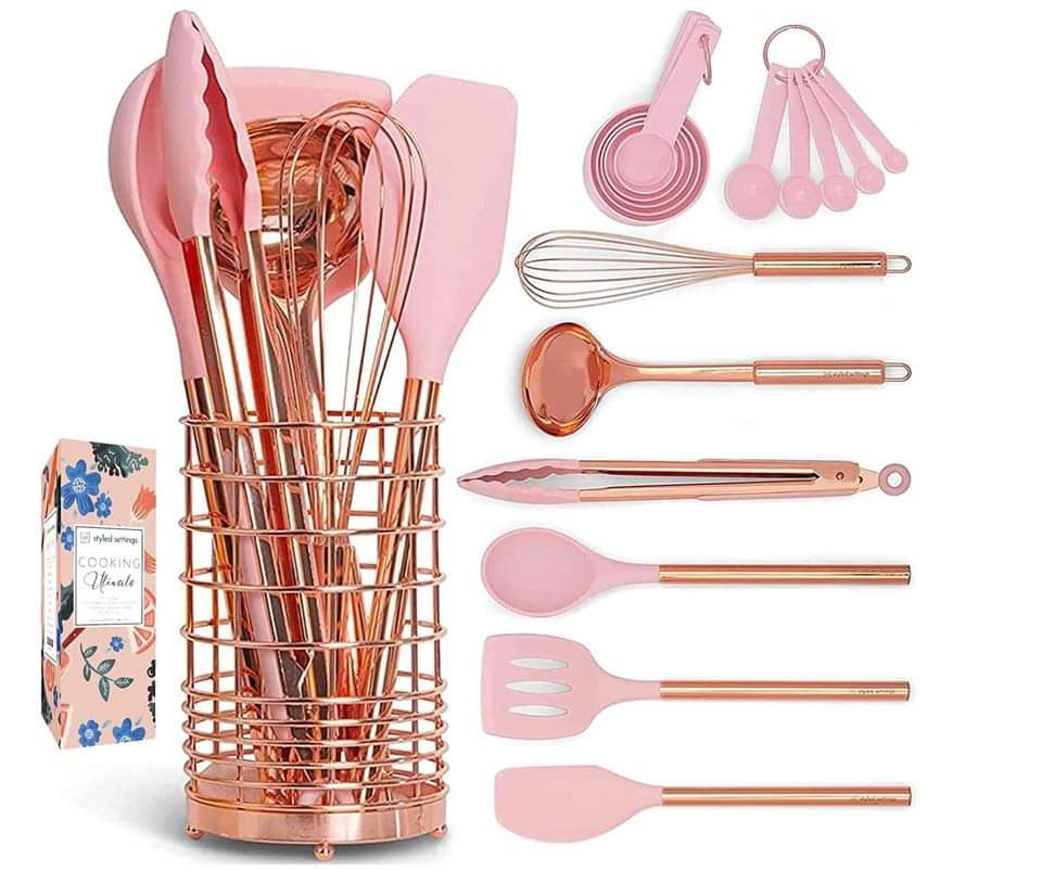 Copper and Pink Kitchen Utensils -17PC Pink Cooking Utensils Set with Holder: Pink Measuring Cups and Spoons Set on de@l + qp0n at checkout Let me know if you grab #ad
