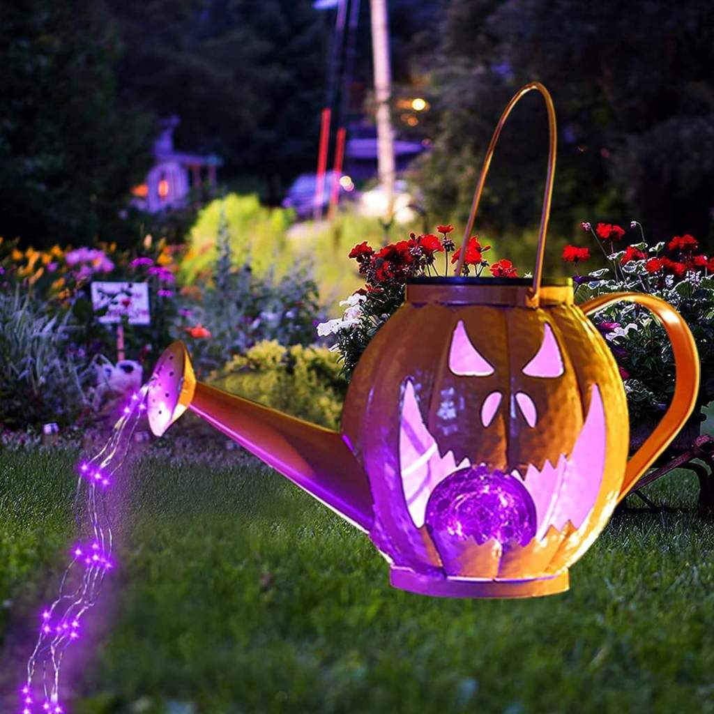 🎃🎃🎃 OH MY!! This Jack-O-Lantern Solar Light is SPOOKTACKULAR!! The perfect Halloween addition to your yard!! The orange Jack-O-Lantern watering can illuminates with a spooky purple glow and has cascading lights too!! Includes a shepherd’s hook for hanging.
