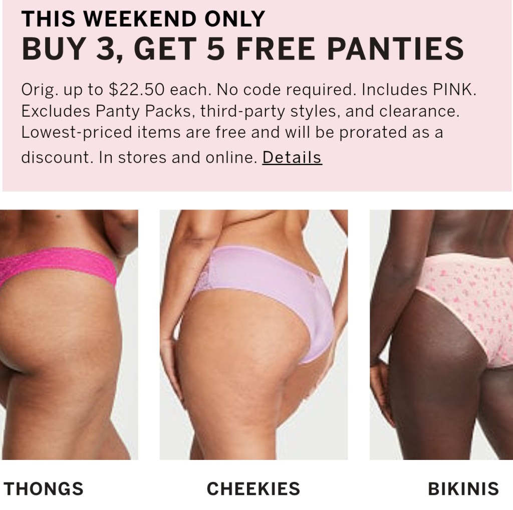 ππ Holy smokes, I thought I read this wrong! Insane Panty savings this weekend at VS and PINK! Buy 3 and get FIVE panties FR3E!! Itβs time to re-stock the top drawer! (Excludes Panty packs.)
