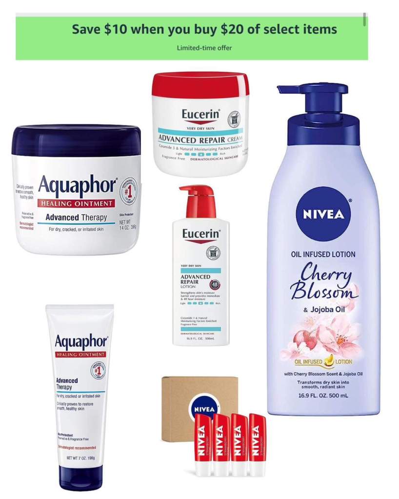 This is such a good one!!! Save $10 on $20 or more purchase of Aquaphor, Eucerin, and Nivea products in the link!!! Just add 💲20 worth of exact items from the link, go to checkout, and you’ll see 💲10 come off!