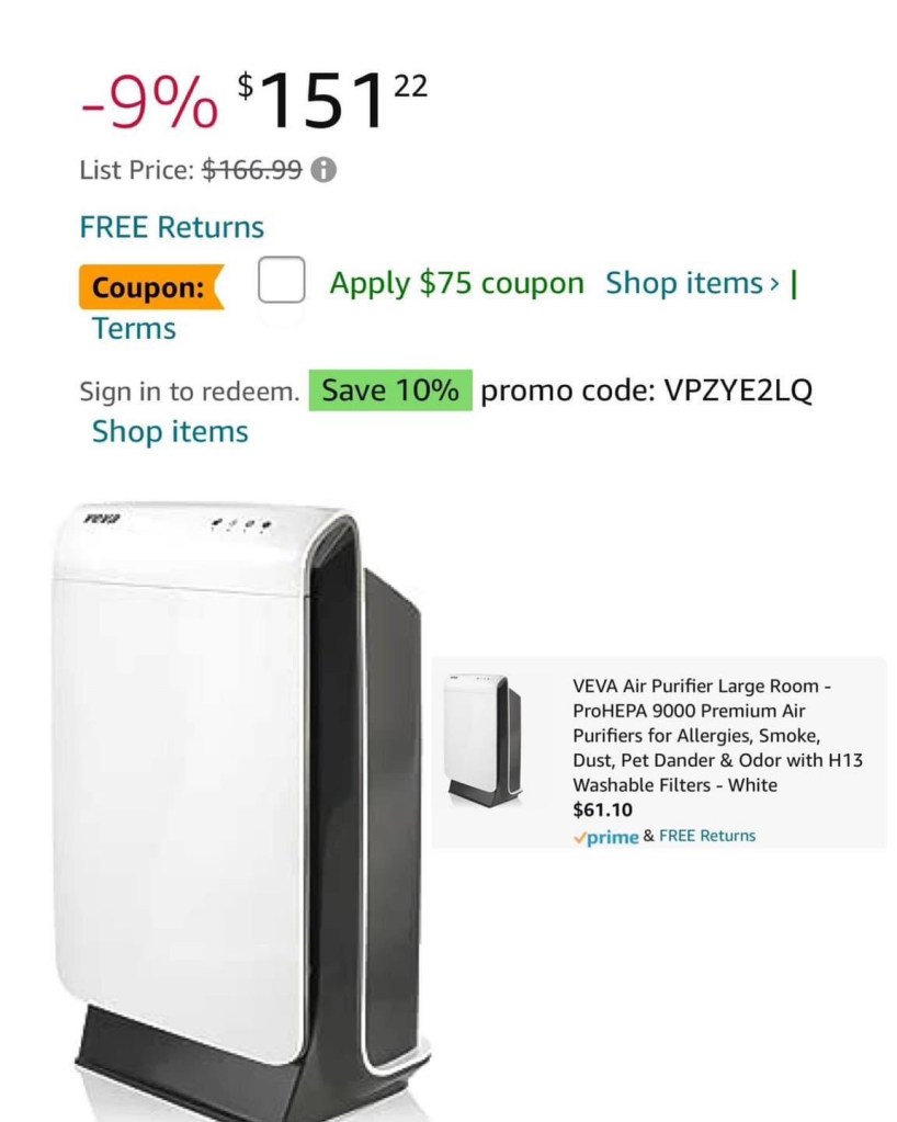 This is insane!! I bet it doesn’t last long either — $75 coupon + extra 10% when you clip “redeem” — great time to grab a large area air purifier! #ad