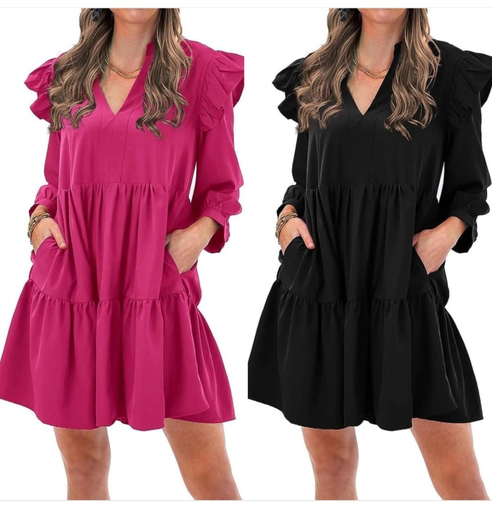 KIRUNDO Women’s 2023 Fall Casual Ruffle Long Sleeve V Neck Mini Dress Loose Tiered Flowy Babydoll Shirt is on 30% 0ff!! #ad