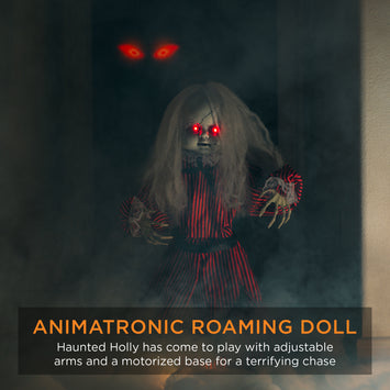 💥💥 OH MY!! The Haunted Holly Animatronic Roaming Doll is SPOOKTACULAR!! Take Halloween to the next level with 4 feet of terrifying fabric, synthetic hair, ghoulish hands, and piercing red LED eyes!!