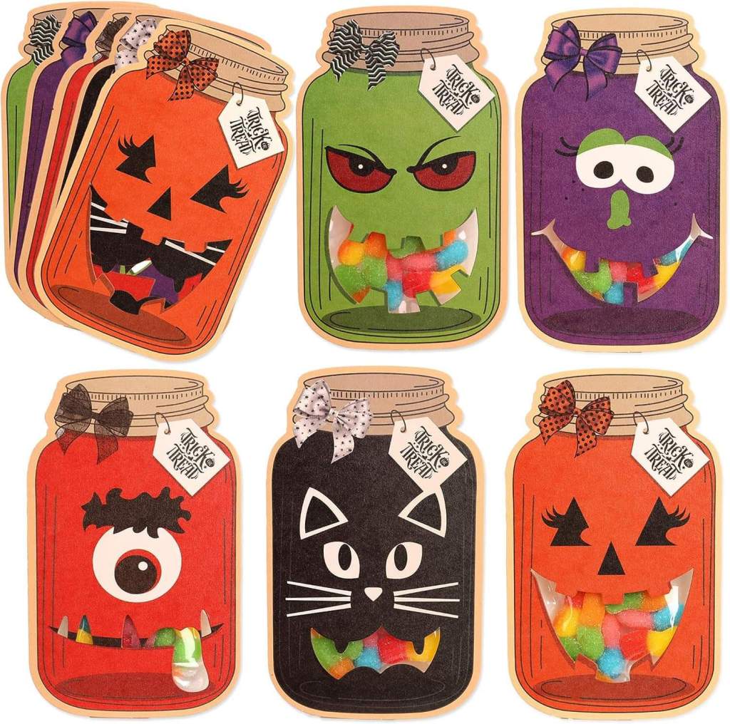 ππ» Halloween fun! These mason jar shaped cards are a super cute way to pass out treats! Includes clear bags and sticky tape to add your treats to the back of the card. Super cute for trunk or treat or class parties! You get a pack of FIFTY for under 11 and the promo works on multiples.