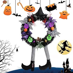 Halloween Wreaths for Front Door, LUKETURE 28.3×15.8 Inch Halloween Front Door Wreath with Hat Witches Legs Pumpkin, is on pr!ce drōp at checkout #ad