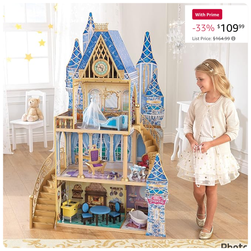 OH MY!! Amazing Prime savings on the KidKraft Disney® Princess Cinderella Royal Dream Wooden Castle Dollhouse!! Stands over 4 feet tall!! Includes 12 pieces of furniture and accessories, including a canopy bed, glass slipper, pillow and more for storytelling adventures for 12-inch dolls.