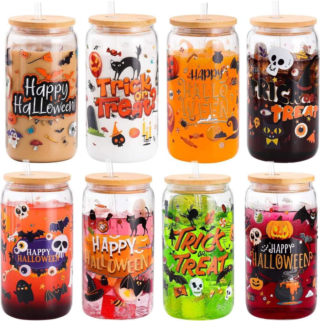 💀🎃🐈⬛ How fun!! This set of 16-oz glasses have the cutest Halloween designs! You get a pack EIGHT with bamboo lids and straws. Perfect for your spooky celebrations!