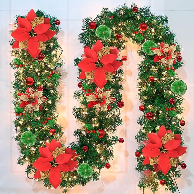Pre-lit Artificial Christmas Garland, Green Rattan with Red Flower Decorations and Battery Operated is 30% 0ff at checkout clip qpon #ad