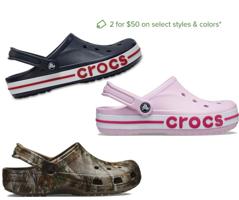 If Crocs are your go to clogs or sandals, you should most definitely check this out. 2 for 50 on select styles and colors and there are lots of different ones to choose from.