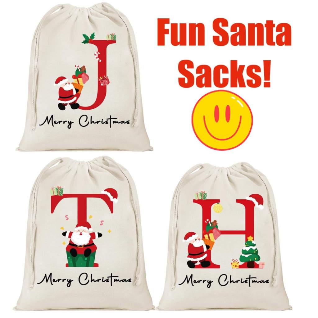 π» What a cute way to wrap a gift! These fun sacks are 20βx27β with a drawstring close, festuve designs, and your favorite personβs initial! Valid on ONE per account.