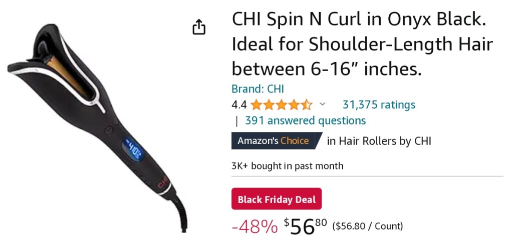 Wow!! The Chi Curl N Spin is down to $56 in the black option!! Love this thing! Itβs so easy to use and very difficult to burn yourself so good for girls/teens!